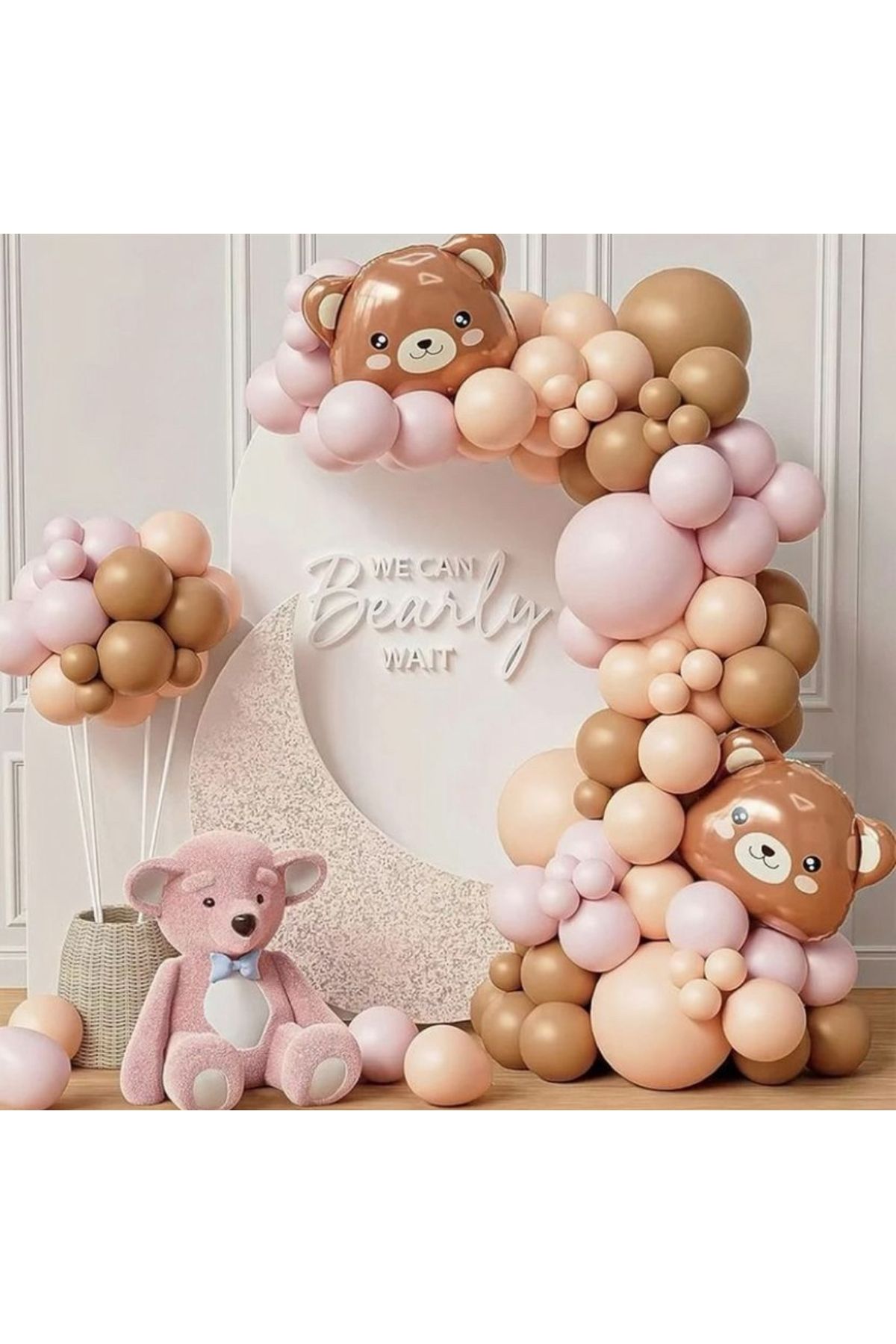 Karamel Kahve Pembe Balon Zinciri Seti 101'li Ayı Kafası Folyo Balonlu