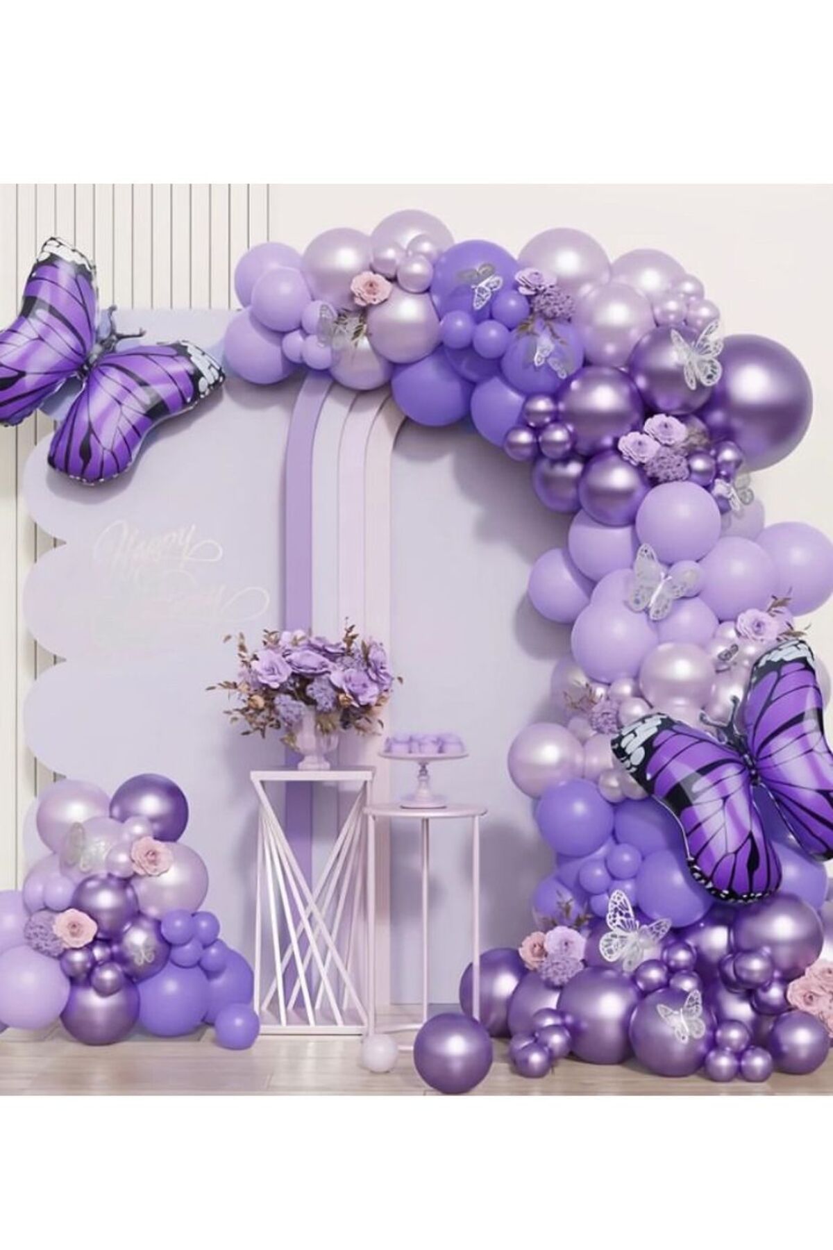 100 adet balon 5 ve 12 inç 1 adet zincir 5 mt 1 adet mor folyo balon 30 cm